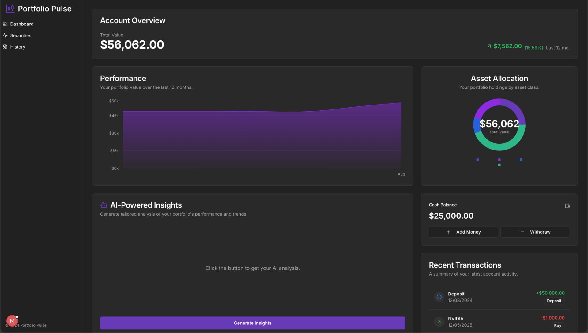 Dual visualization via line charts (portfolio value over time) and pie charts (asset allocation)